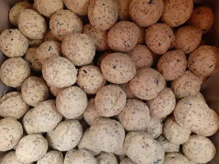 - Fat Balls containing - Kibbled Maize, Wheat, Beef Tallow, Red Dari, Sunflower Hearts. Includes Calcium Carbonate.