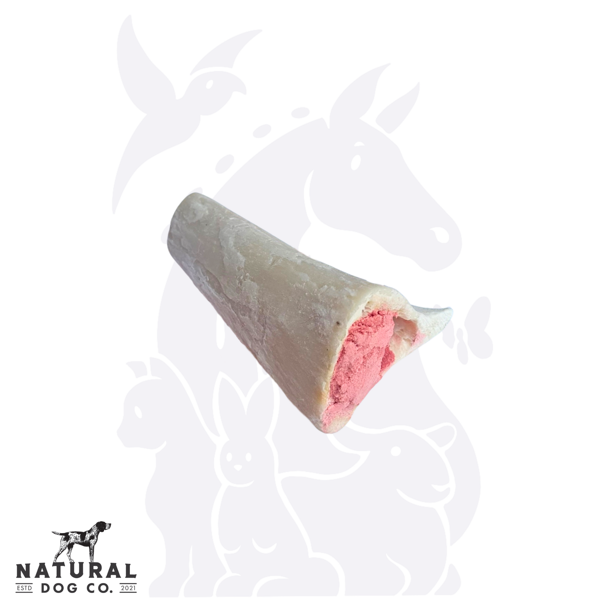 This 100% natural treat features a 4″ British beef marrow bone filled with delicious meaty stuffing. Slowly air dried to retain nutrients and flavours, it's free of artificial preservatives and colours. Ideal for rewarding good behaviour or keeping your dog occupied, this treat supports dental health and provides essential protein and calcium. Suitable for dogs over 6 months, it's a tasty and nutritious option for dogs of all breeds and sizes.