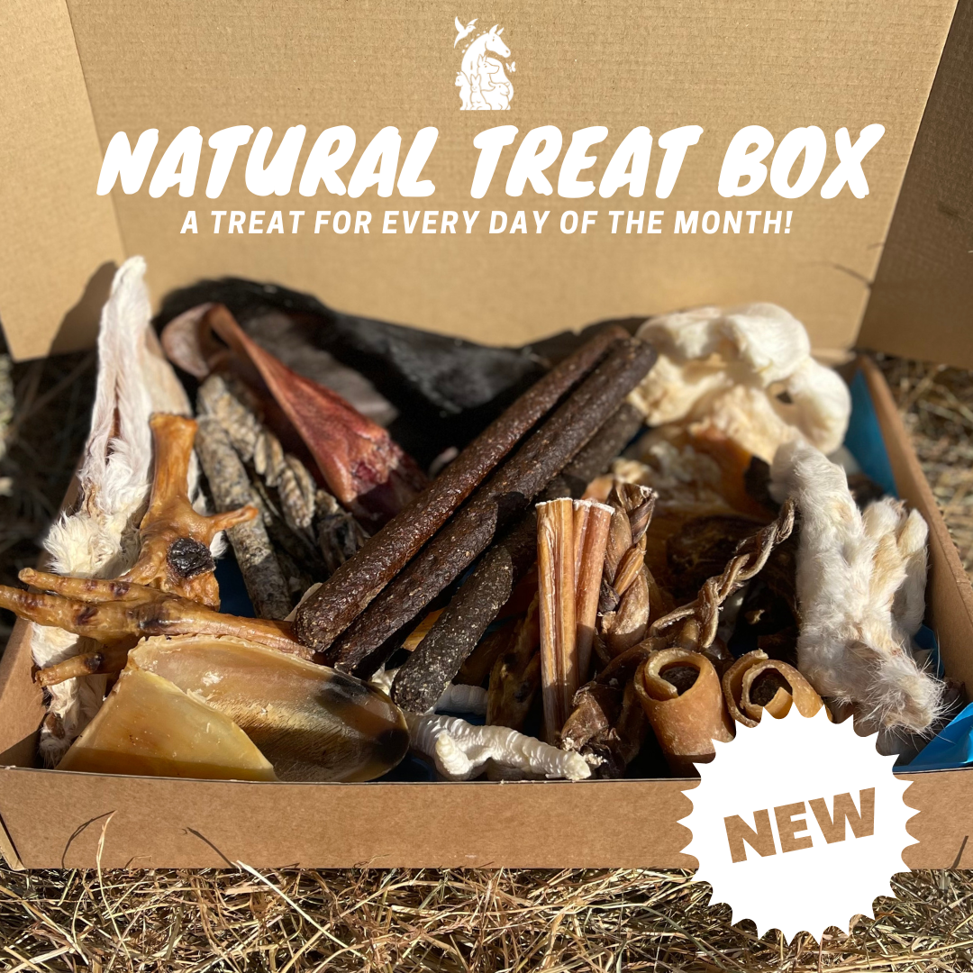 Our dog Natural Treat Box is the perfect selection for your canine friend. It contains a variety of treats, including both long-lasting favourites (beef skin, hoof, cow ear), as well as smaller treats which can be used to both train and reward your pet.