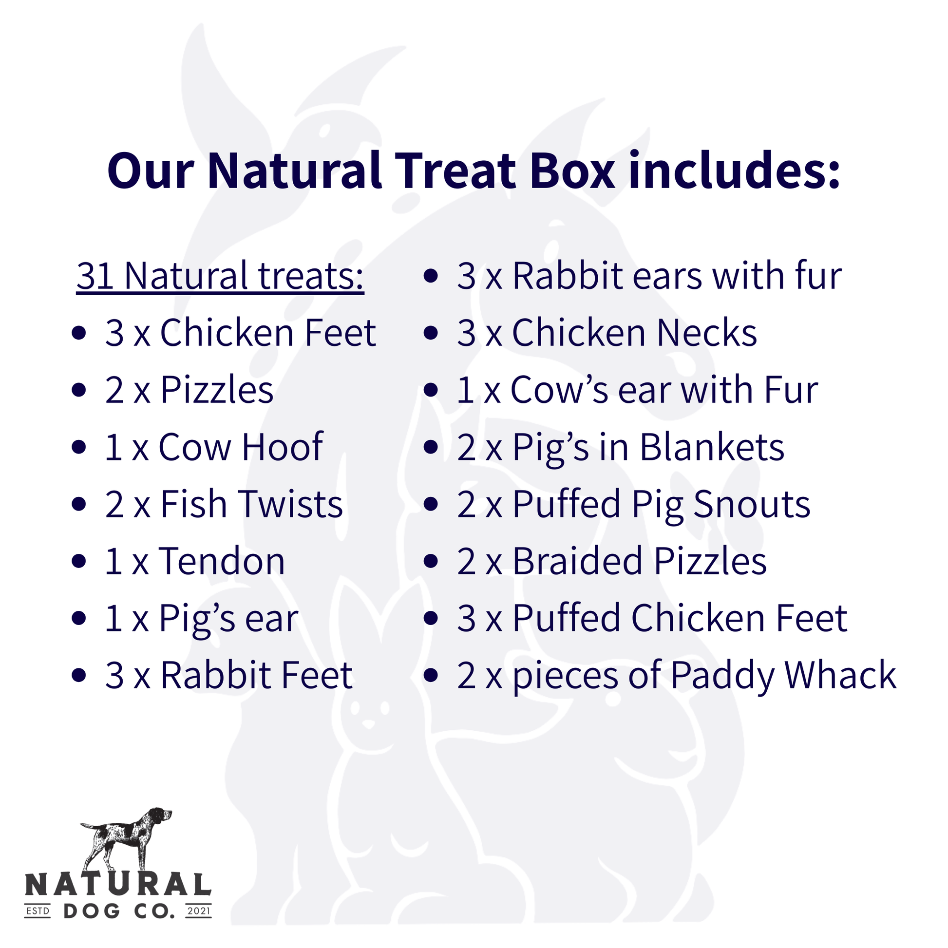 The box gives you a good mix of longer-lasting chews as well as everyday treats and on average is designed to last approximately one month - each box containing 31 treats