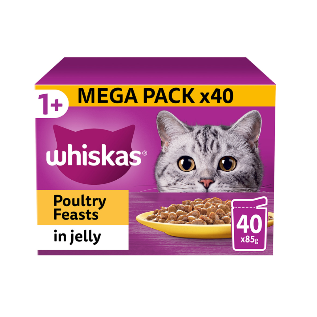 Whiskas 1+ Poultry Feasts adult cat food pouches in jelly are specially prepared to preserve the natural goodness and deliciousness of high quality ingredients and will see your cat rush to the bowl faster than ever before!
